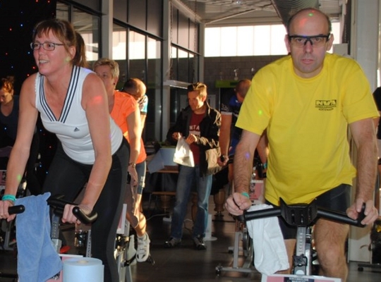 Kortenaken - In gemeentelijke Sporthal De Vruen in Waanrode vond zaterdag van 10 tot 22 uur een spinningsmarathon plaats voor het goede doel. Elf ploegen namen deel, ten voordele van de lokale vereniging voor mensen met een beperking TuCiMaNi en de Cliniclowns. Onder de elf ploegen ook een team van SP.A Plus en N-VA, broederlijk naast elkaar. De verleiding was voor ons te om de grappige opmerking "Dit is nu het ideale moment om coalitievormingsgesprekken te beginnen, met het vooruitzicht op de komende gemeenteraadsverkiezingen" niet te maken. "Ik heb te weinig adem", antwoordde Benny Hermans (N-VA) lachend. Griet Vandewijngaerden, fractieleider van SP.A Plus, lachte geamuseerd mee.